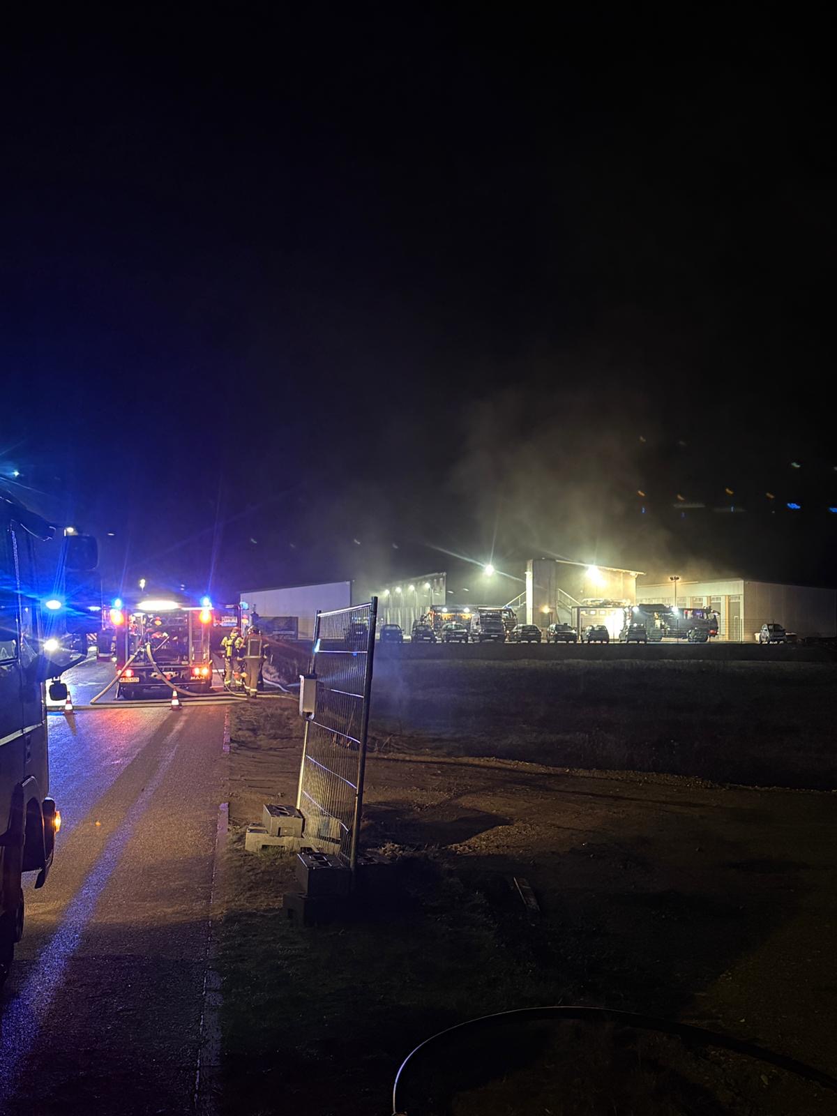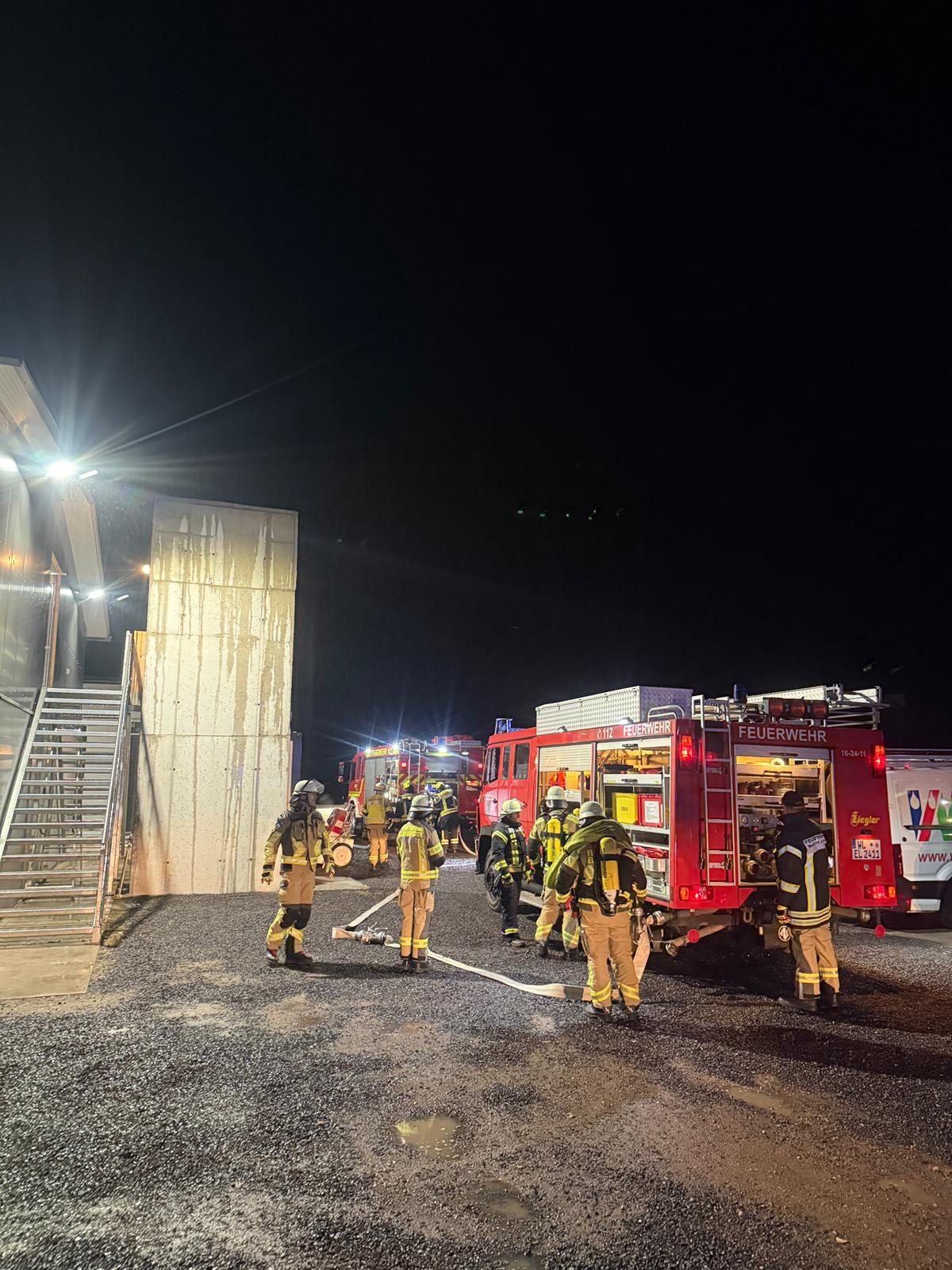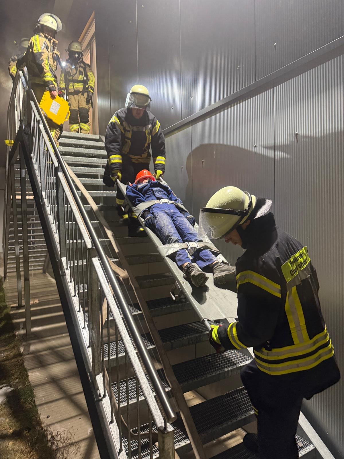 Die besondere Herausforderung der Übung bestand darin, dass sich zu rettende Personen im Obergeschoss eines Gebäudes befand, während sich der Brand in der darunterliegenden Lagerhalle befand.